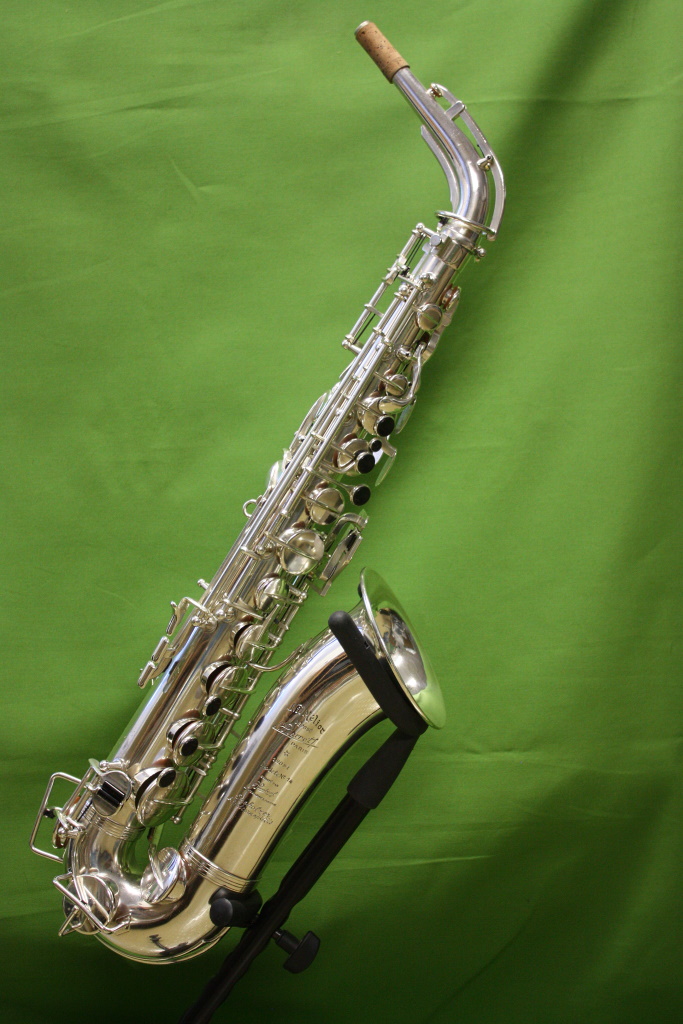 Das Saxophon ist mit meinen eigenen, ein-/ausschraubbaren Resonatoren ausgestattet und auch die abgegriffenen Perlmutt-Einlagen habe ich durch selbst hergestellte Inlays erneuert. Das Teil liegt jetzt richtig gut in den Fingern und geht los wie die anderen Franzosen in meinen Angeboten.